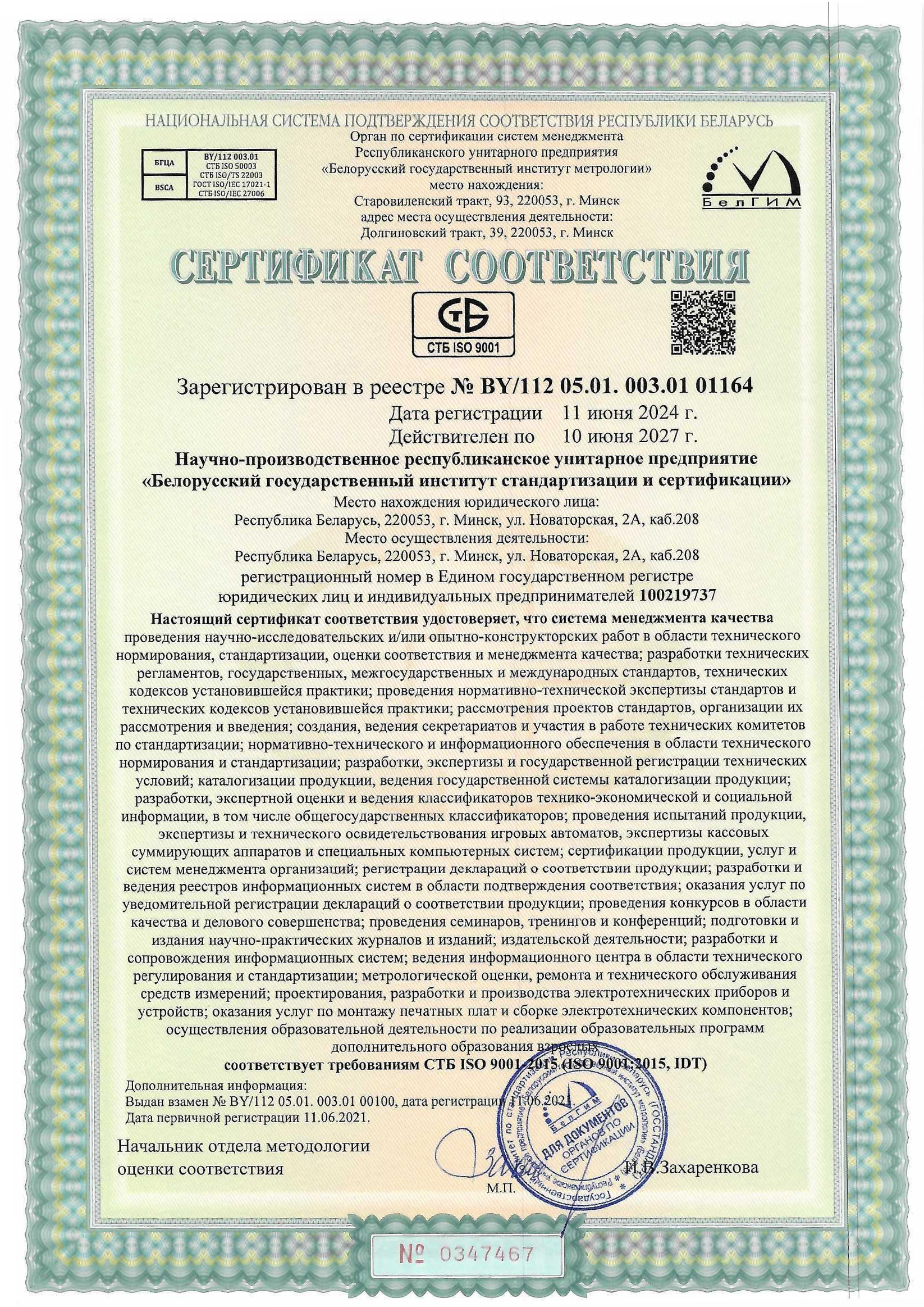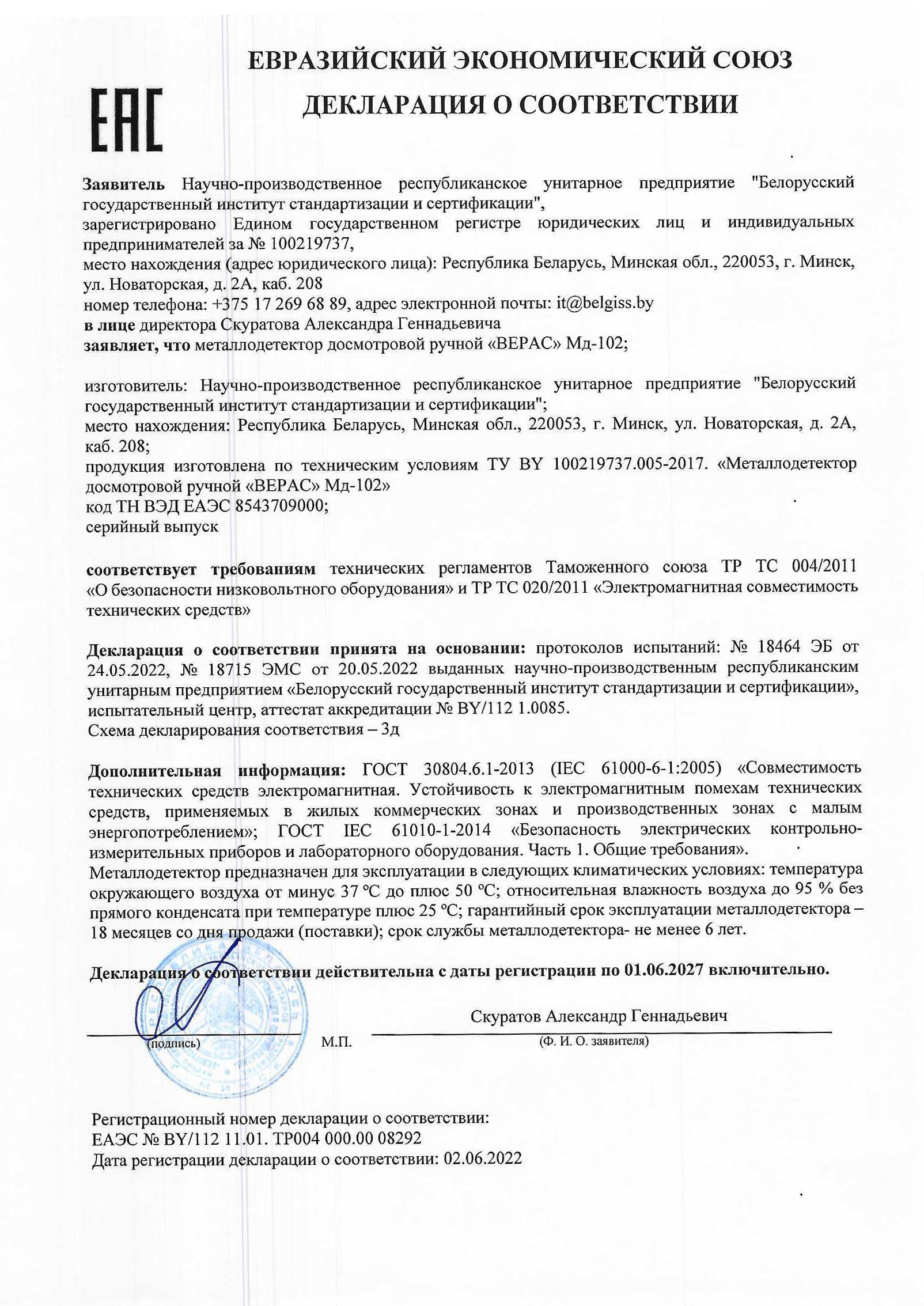 Декларация о соответствии ЕАЭС №BY/112 11.01. ТР004 000.00 08292 от 02.02.2022 действителен до 01.06.2027