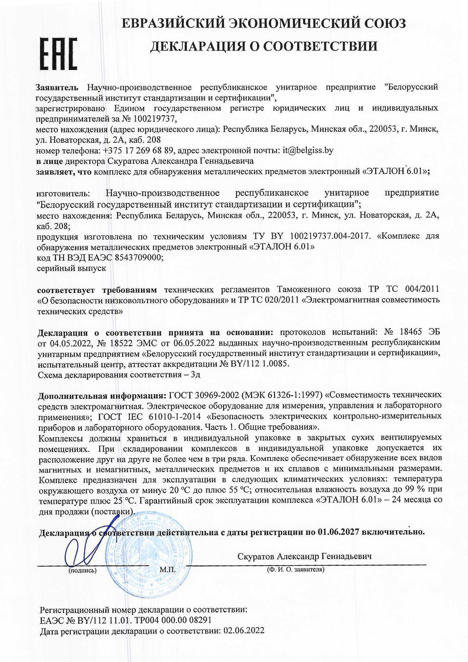 Декларация о соответствии ЕАЭС №BY/112 11.01. ТР004 000.00 08291 от 02.02.2022 действителен до 01.06.2027